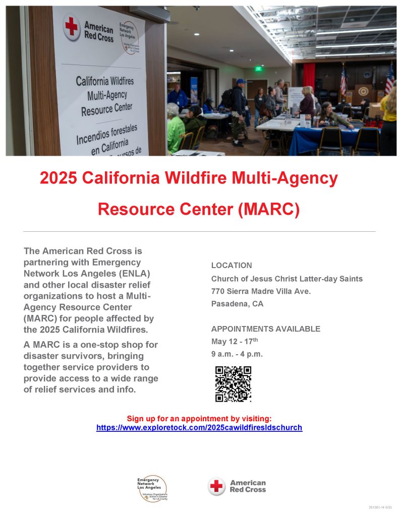- May 12-17, 9am-4m daily, 2025 California Wildfire Multi-Agency Resource Center (MARC) at Church of Jesus Christ Latter-day Saints, 770 Sierra Madre Villa Ave, Pasadena, CA