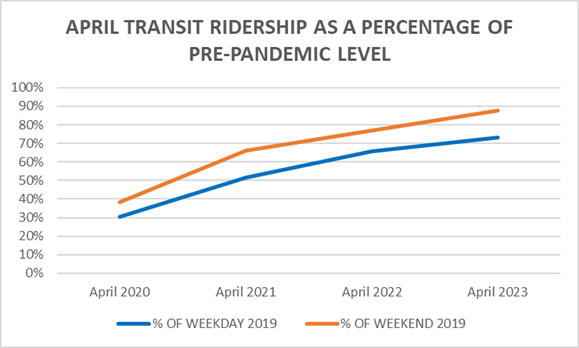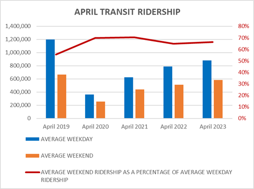 Weekend ridership has become a bigger share of Metro’s overall ridership over the past three years. In April 2019, average weekend ridership was just 55 percent of average weekday ridership. In April 2023, average weekend ridership was 66.4 percent of the average weekday ridership.