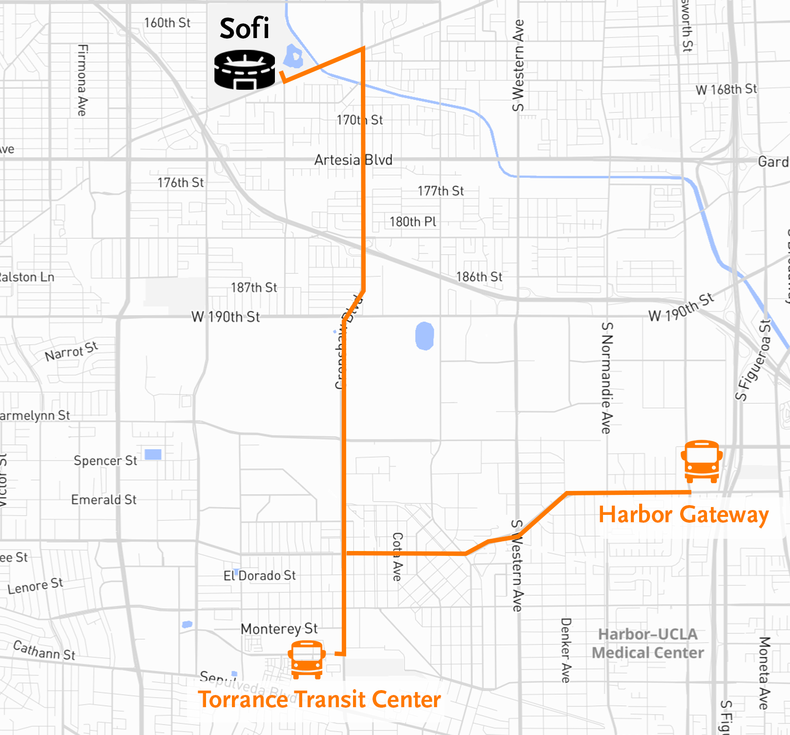 - Hop on the bus from Torrance Transit Center (aka Mary K. Giordano Regional Transit Center 465 Crenshaw Blvd., Torrance, CA.) to SoFi Stadium.