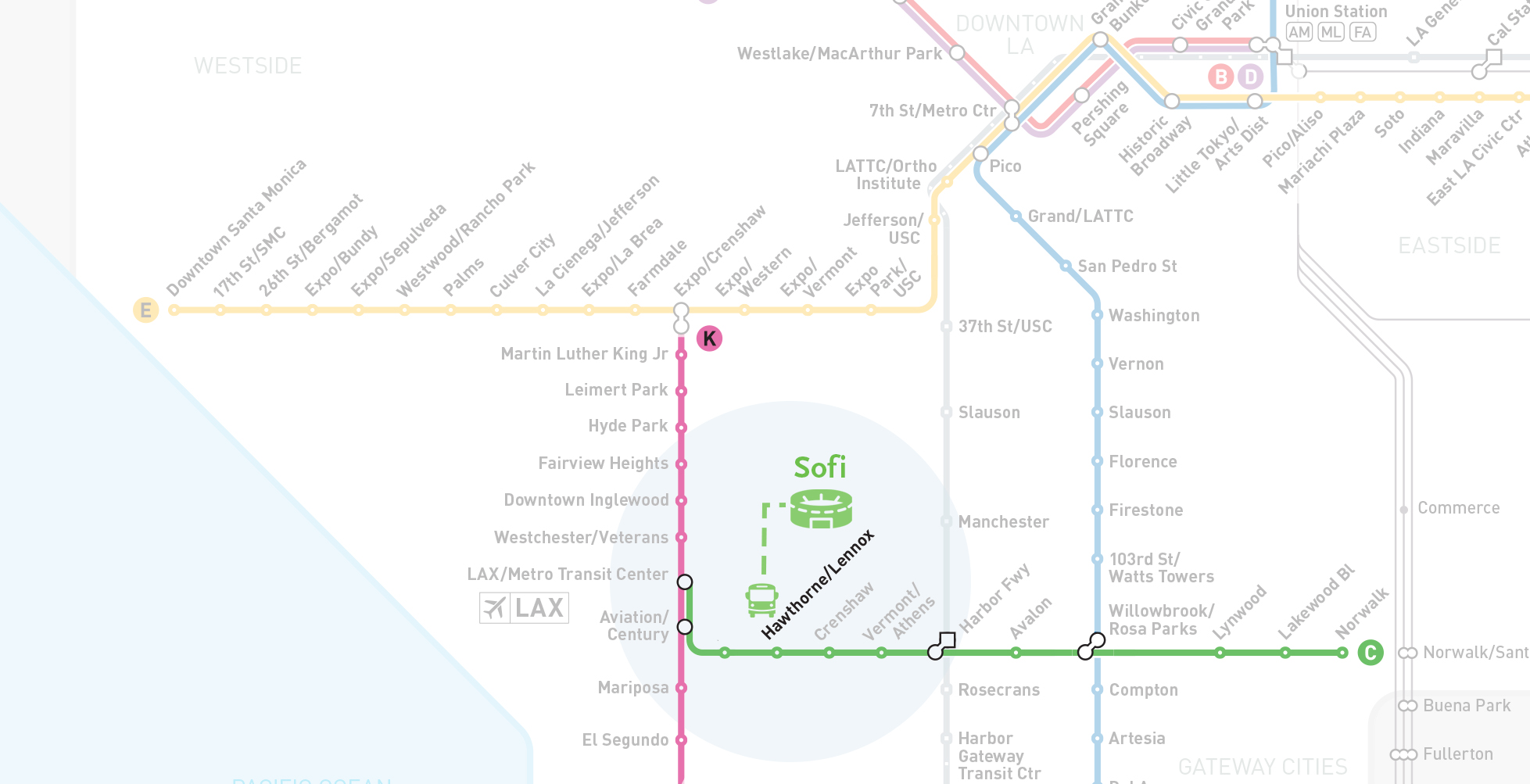The free shuttle operates between the Hawthorne/Lennox Station and SoFi Stadium ONLY during SoFi’s pre-, regular- and post-season NFL games and select special events.
